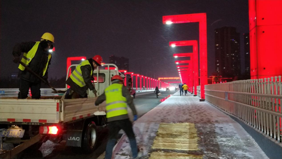 2月17日傍晚7:30至凌晨1點,申飛建工公司出動撒布車3臺,清運車3臺,鐵鍬20把,推雪鏟10把,搶險隊員30余人,對申城大橋、民權大橋、新十八大街高架橋撒布融雪劑4噸,對有坡度的人行道鋪墊防滑草墊。。