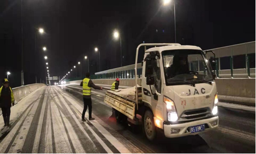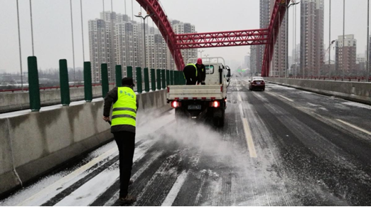 2月18日凌晨5:00至上午9:00,申飛建工搶險隊再次對新十八大街高架橋巡查和撒布融雪劑2噸,確保清晨市民暢通出行。