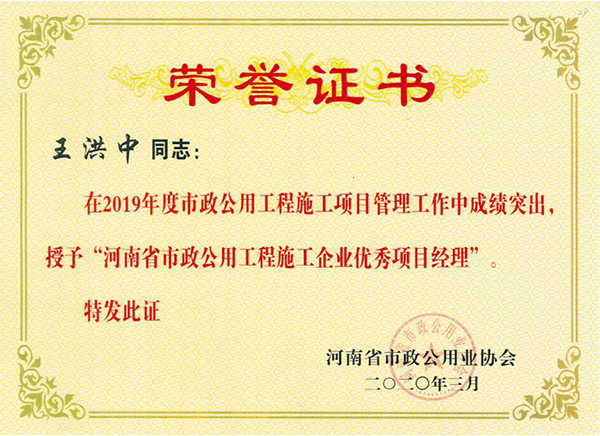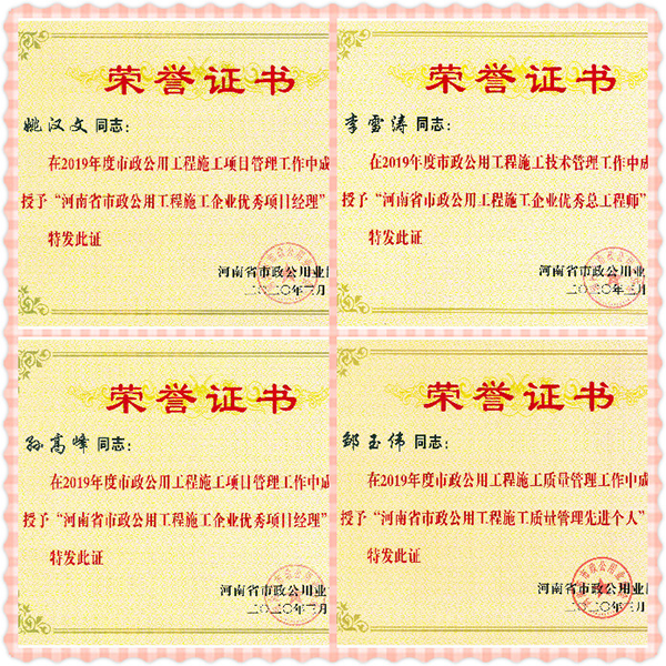 同時,公司多人分別獲得“河南省市政公用工程施工企業(yè)優(yōu)秀總工程師”、“河南省市政公用工程施工企業(yè)優(yōu)秀項目經(jīng)理”、“河南省市政公用工程施工質(zhì)量管理先進(jìn)個人”等榮譽(yù)稱號。市政公司始終堅持高標(biāo)準(zhǔn),嚴(yán)要求,精心管理,狠抓質(zhì)量要點,科學(xué)施工,不論是工程硬件還是工程軟件都為此次授評奠定了堅實的基礎(chǔ),為公司贏得了榮譽(yù)。